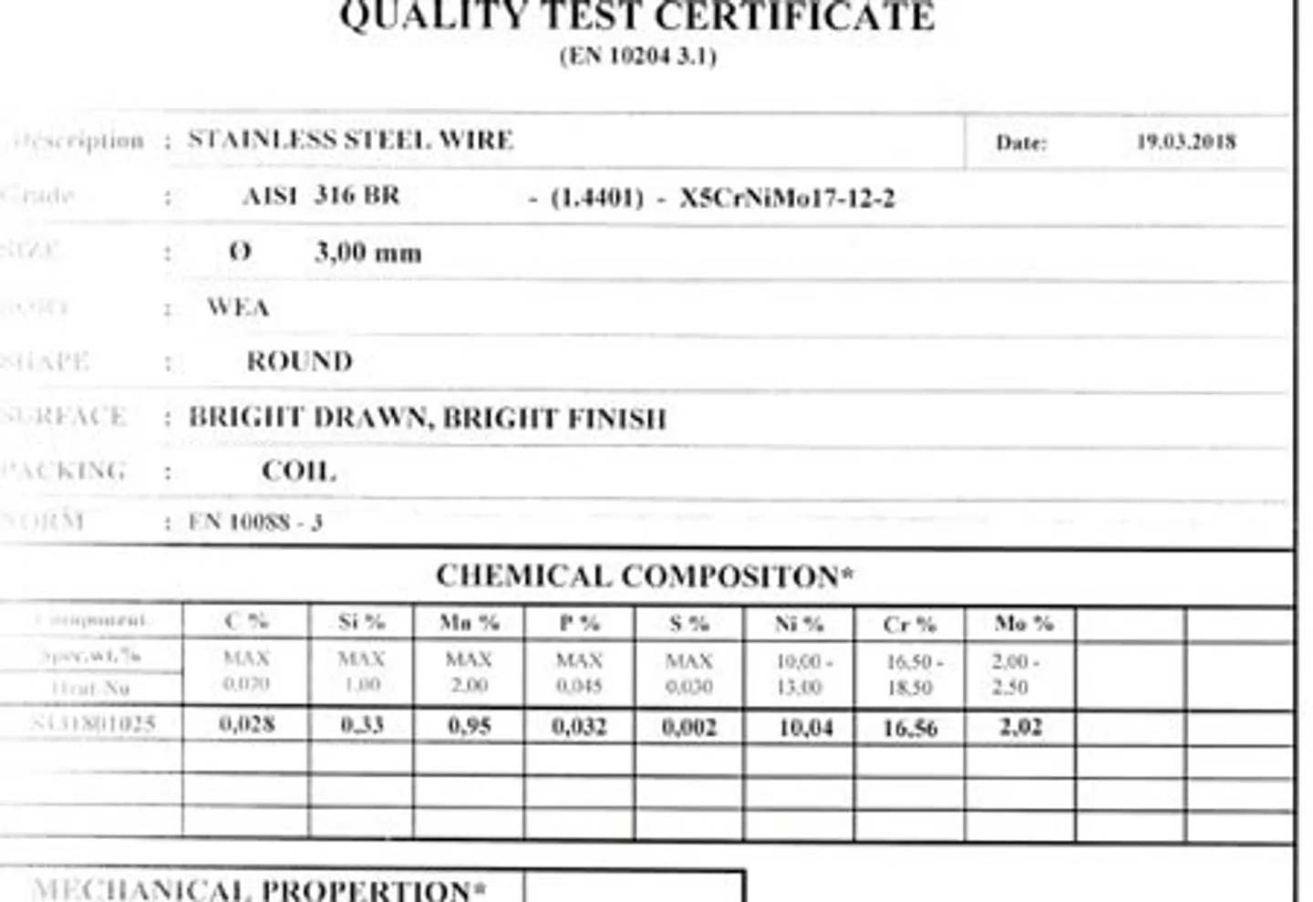 İstenildiği takdirde malzemenin paslanmaz 304 kalite sertifikası verilmektedir.