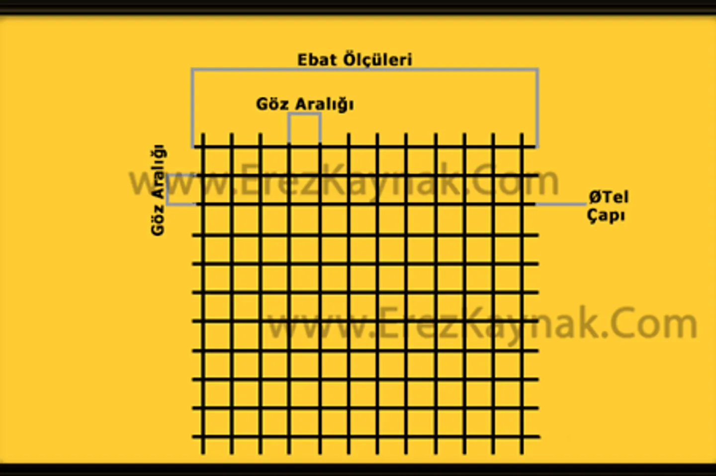Göz aralığı: Standart olarak merkezden merkeze 15mm , 20mm , 25mm ve katlarında yapabiliyoruz. Örnek olarak; 15mm katı olan 15x90mm veya 25mm katı olan 50x125mm gibi istediğiniz ölçüde çelik hasır yapabilmekteyiz. Özel göz aralıklarında (örn; 26,3×37,5mm vb.) yeni kalıp yaparak hızlı bir şekilde müşterilerimizin ihtiyacı olan çelik hasırı uygun bir maaliyet ile üretiyoruz.